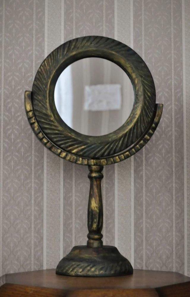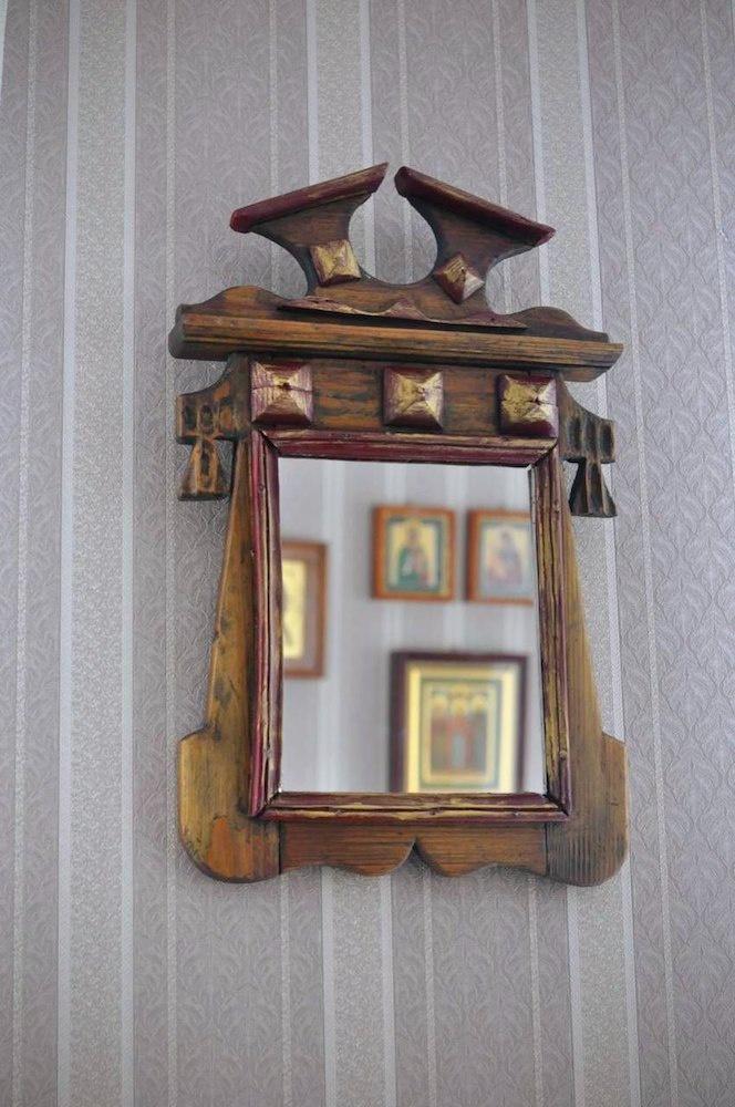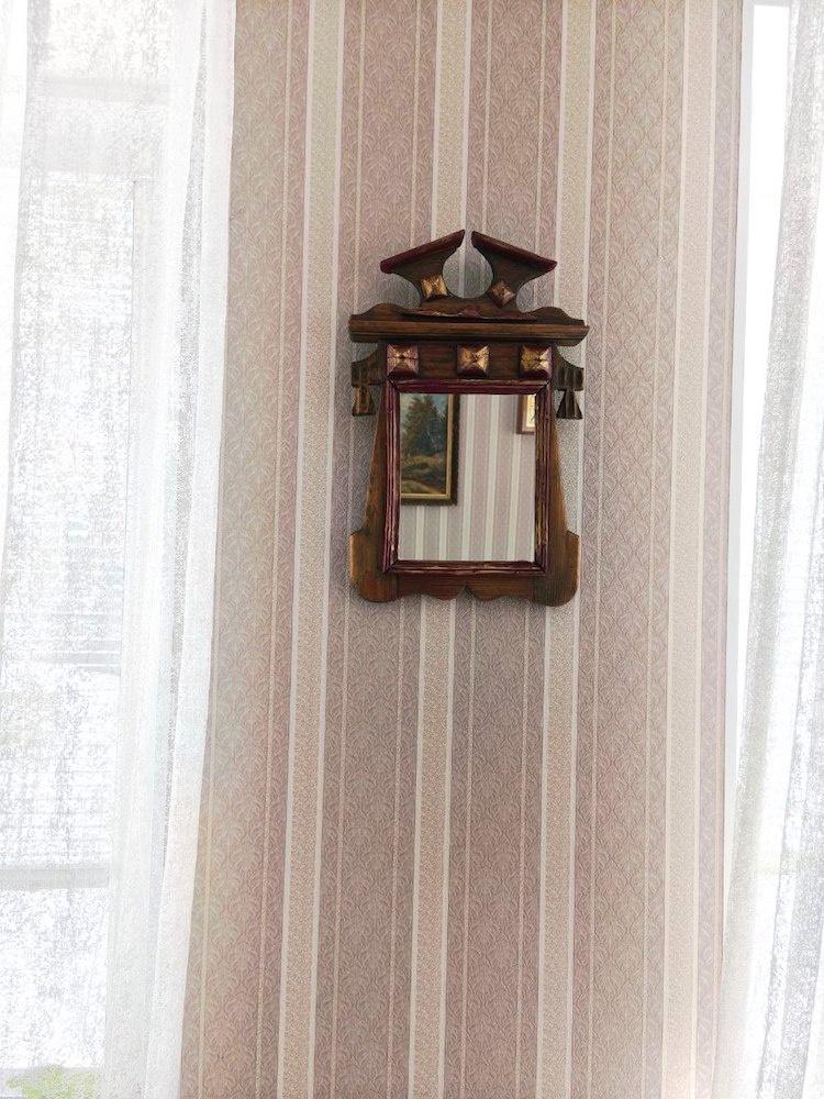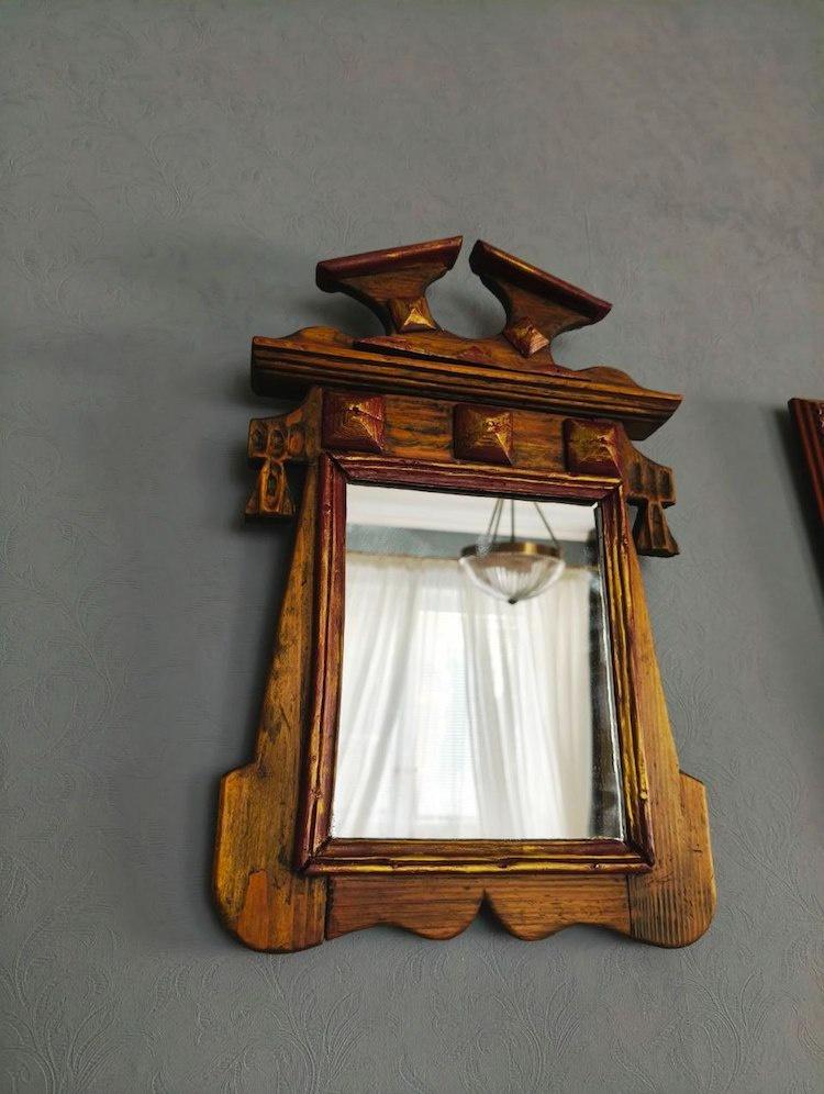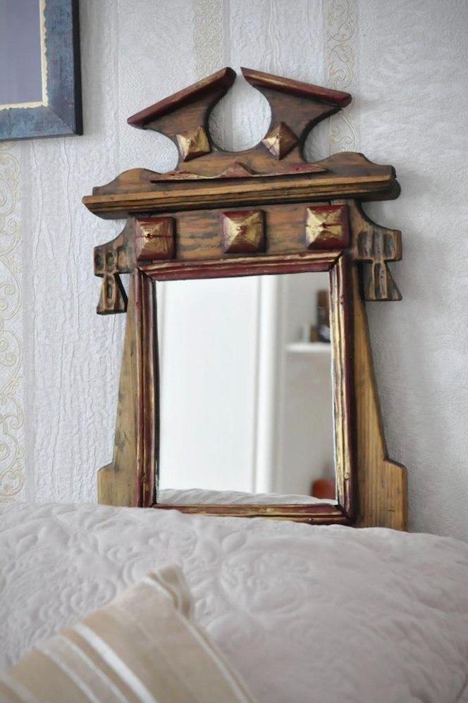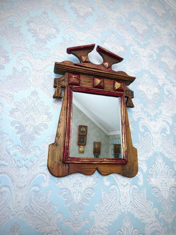 В навершии этого, казалось бы, обычного деревенского зеркала можно рассмотреть пирамиду - символ могущества и вечной жизни. Да и вообще эта рама вовсе не так проста, как кажется на первый взгляд. «Дочь Монтесумы» - небольшое зеркало с неповторимым шармом, с характером, как у отважной ацтекской принцессы.